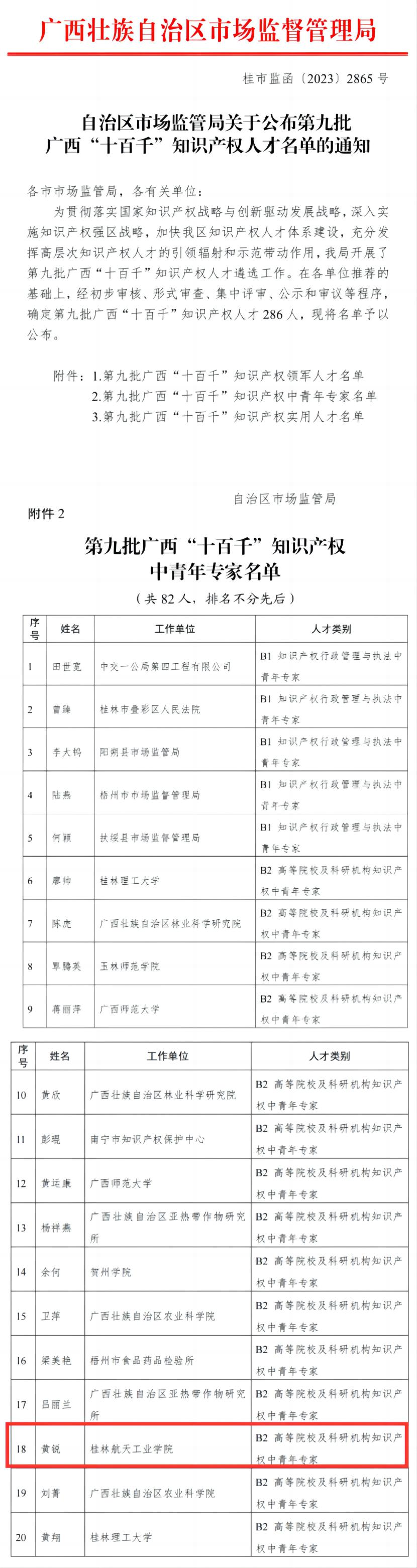 近日,自治区市场监管局发布《关于公布第九批广西“十百千”知识产权人才名单的通知》(桂市监函〔2023〕2865号),PA视讯集团网站黄锐教授入选广西“十百千”知识产权中青年专家。这是PA视讯集团网站首次申报并入选广西“十百千”知识产权人才。