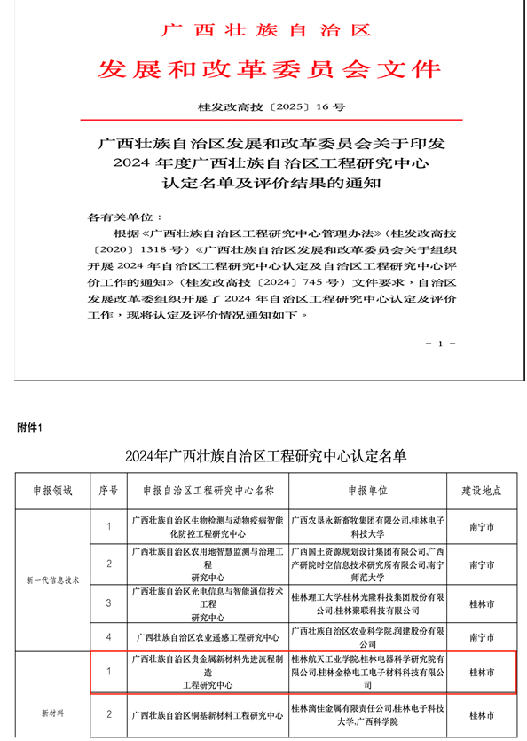 近日,根据《关于印发2024年度广西壮族自治区工程研究中心认定名单及评价结果的通知》(桂发改高技〔2025〕16号),PA视讯集团网站牵头申报的“广西贵金属新材料先进流程制造工程研究中心”正式获广西壮族自治区发展和改革委员会批准建设,这是PA视讯集团网站再次以第一单位获批自治区工程研究中心,实现了PA视讯集团网站在该类省部级科研平台上的再次突破。