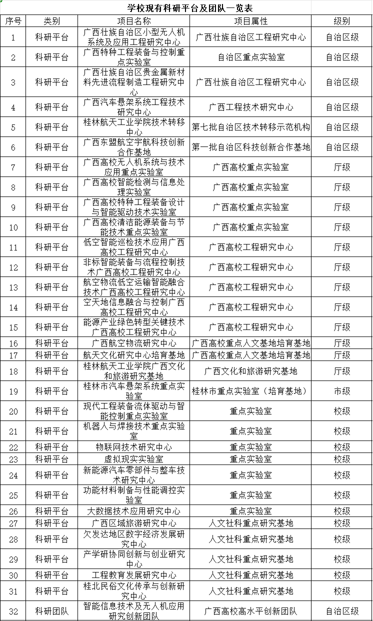 学校现有1个广西重点实验室,2个自治区级工程研究中心,1个自治区级工程技术研究中心,1个自治区科技创新合作基地,4个广西高校重点实验室、5个广西高校工程研究中心、2个广西高校人文社科重点研究培育基地,1个广西文化和旅游研究基地,1个桂林市重点实验室,12个校级科研平台,1个广西高校高水平创新团队(智能信息技术及无人机应用研究创新团队),获批为自治区技术转移示范机构。